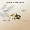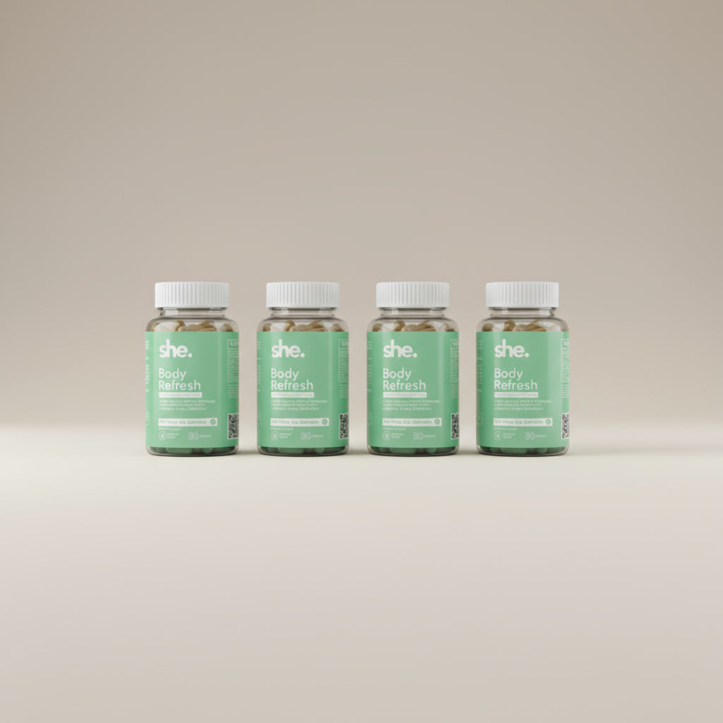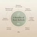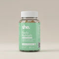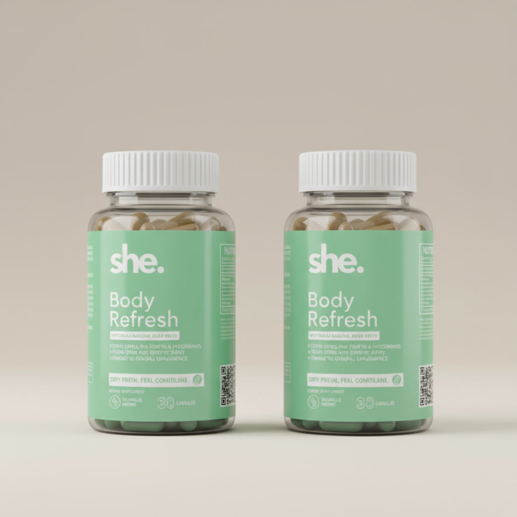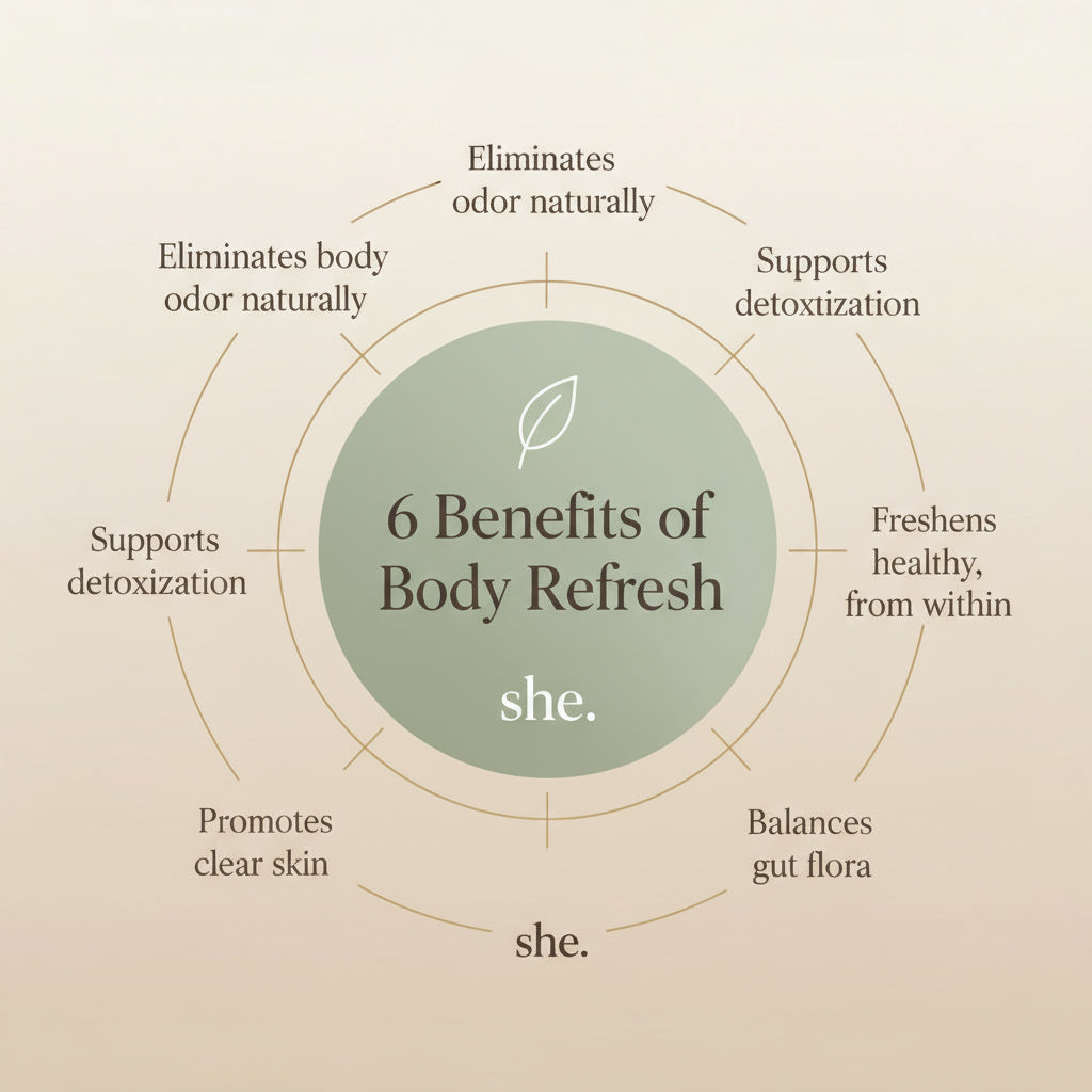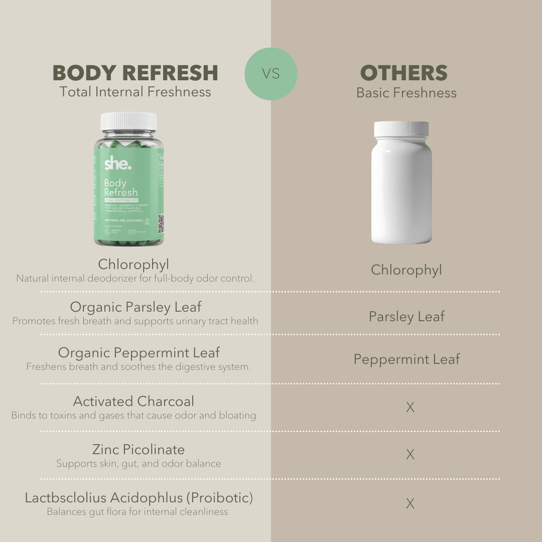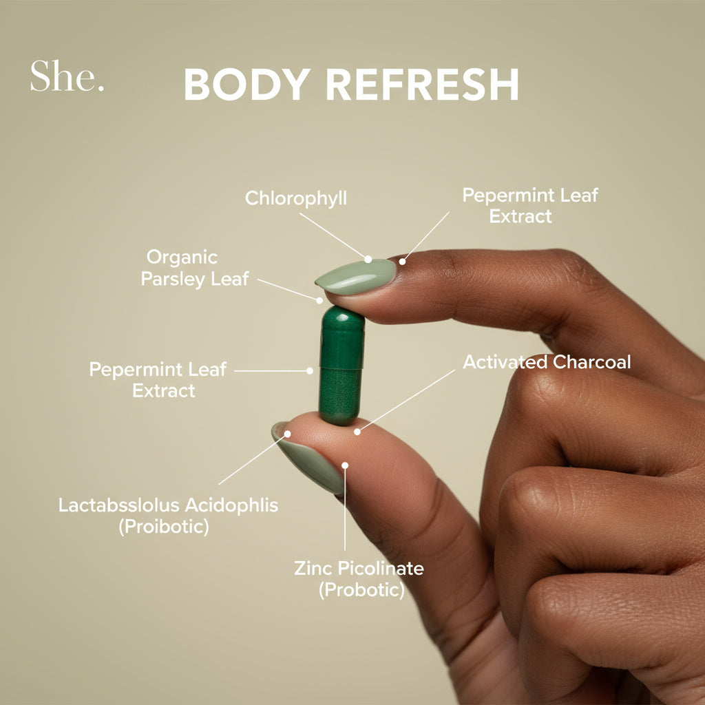She. Body Refresh is a plant-based chlorophyll detox capsule designed to neutralize odor from the inside out. Infused with chlorophyll and organic peppermint, this daily supplement supports gut health, reduces body odor, and promotes internal balance—so you stay fresh, confident, and radiant all day.