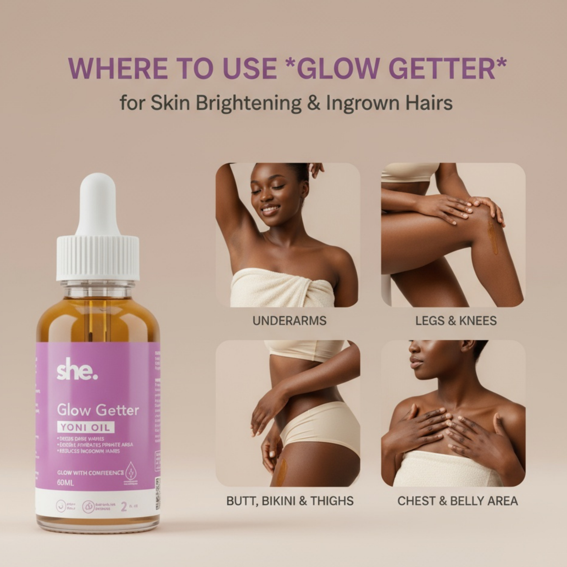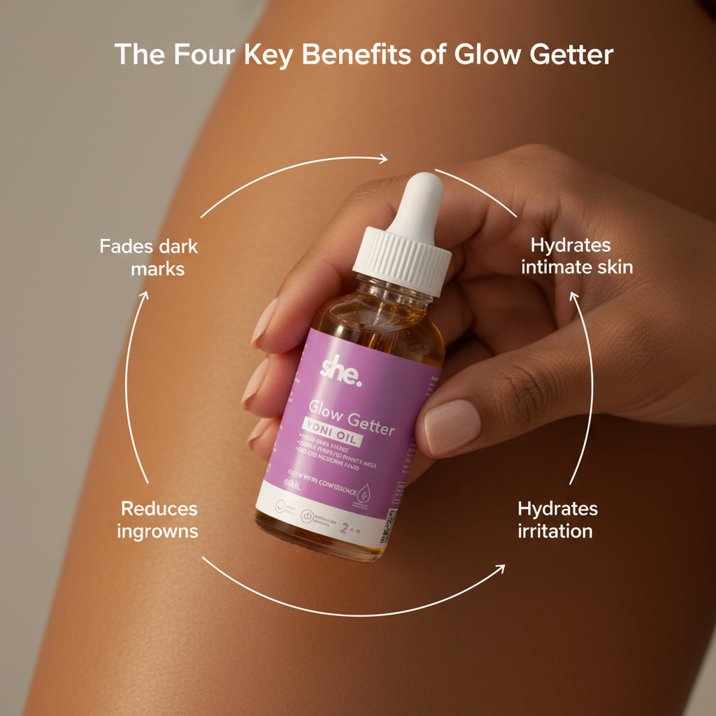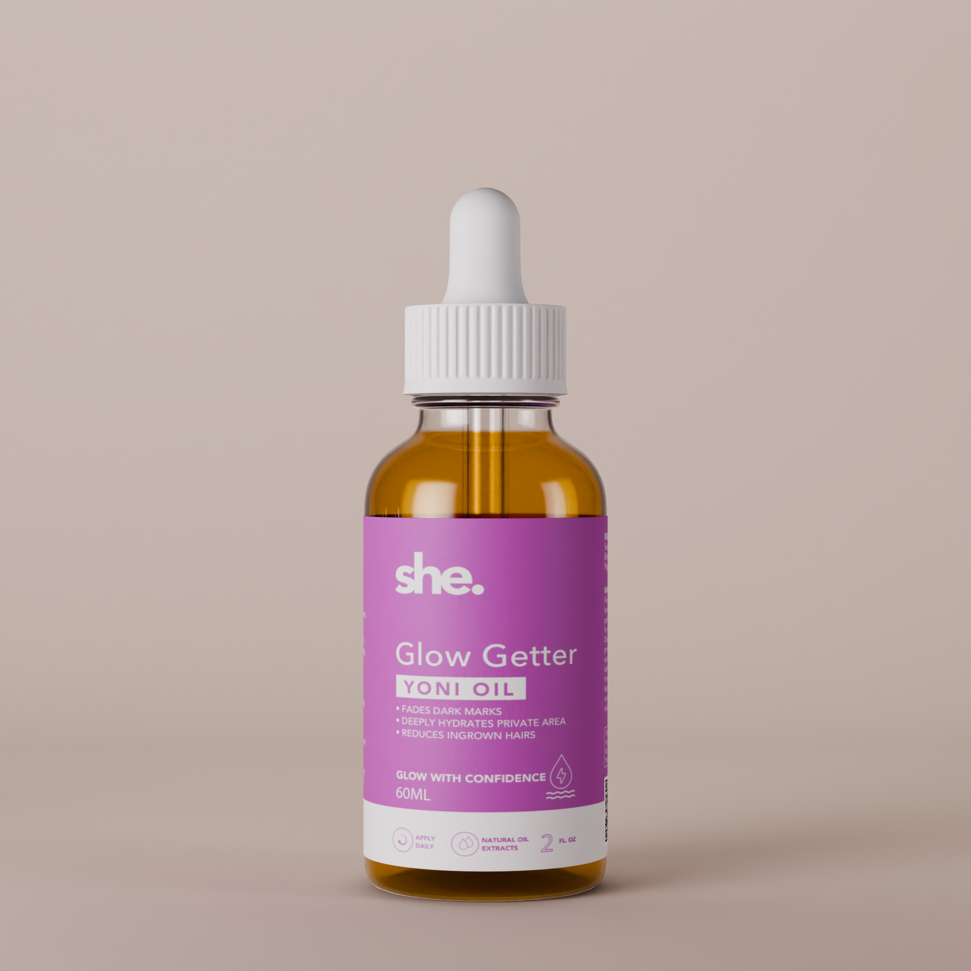 She. Glow Getter is an all-natural, plant based oil blend designed to nourish and protect intimate and delicate areas. Apply a few drops to clean, dry skin—perfect for the bikini zone, inner thighs, booty, underarms, or anywhere needing extra hydration and care.