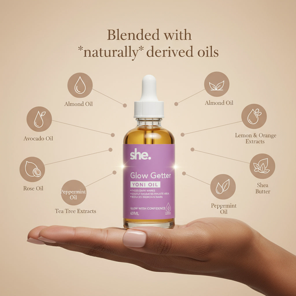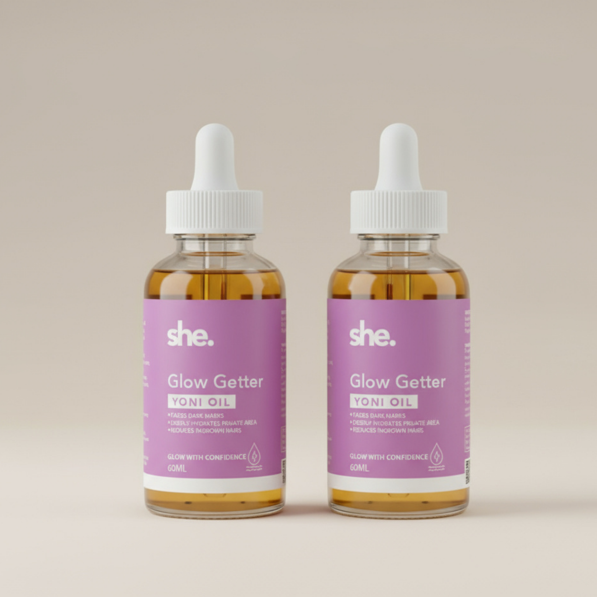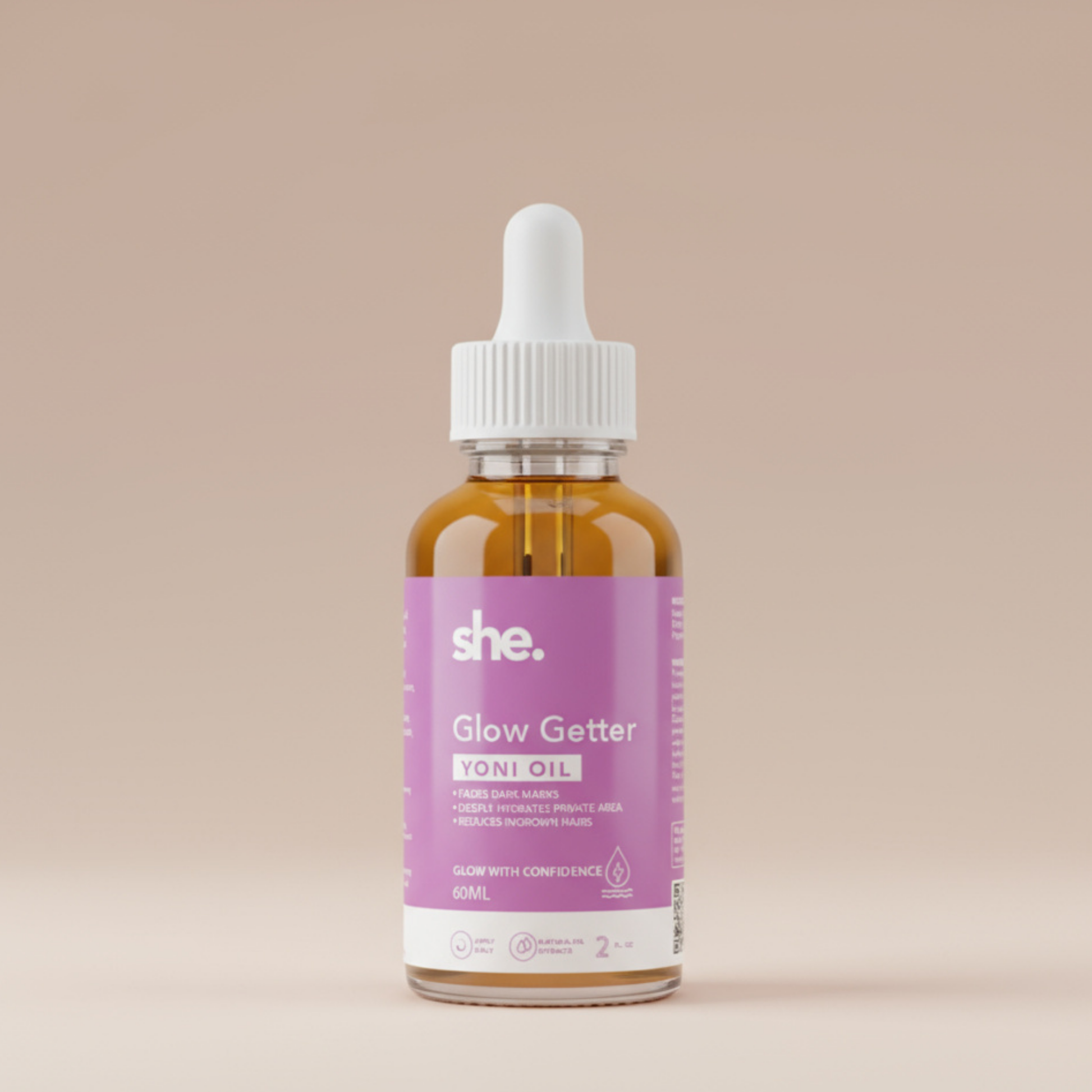 She. Glow Getter is an all-natural, plant based oil blend designed to nourish and protect intimate and delicate areas. Apply a few drops to clean, dry skin—perfect for the bikini zone, inner thighs, booty, underarms, or anywhere needing extra hydration and care.