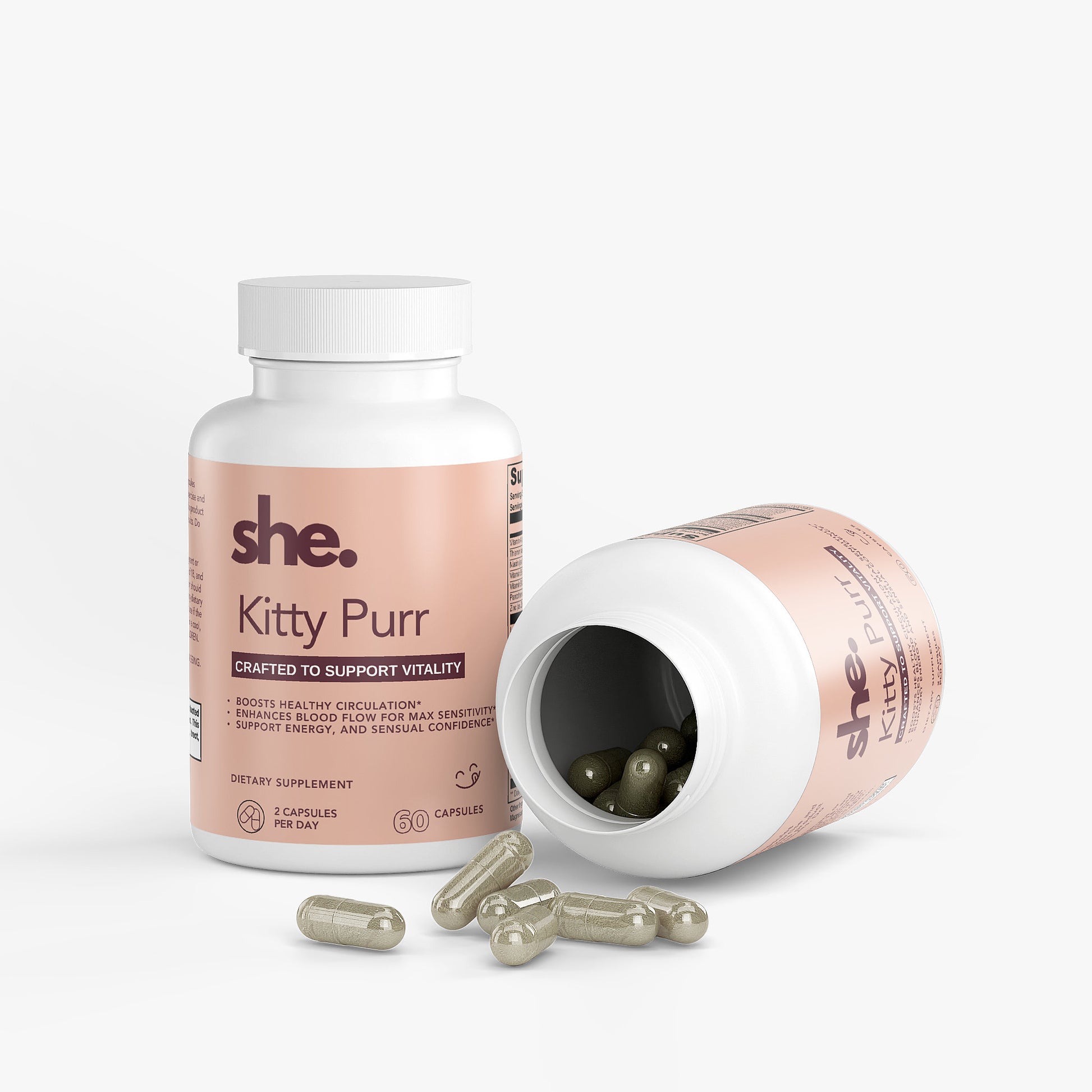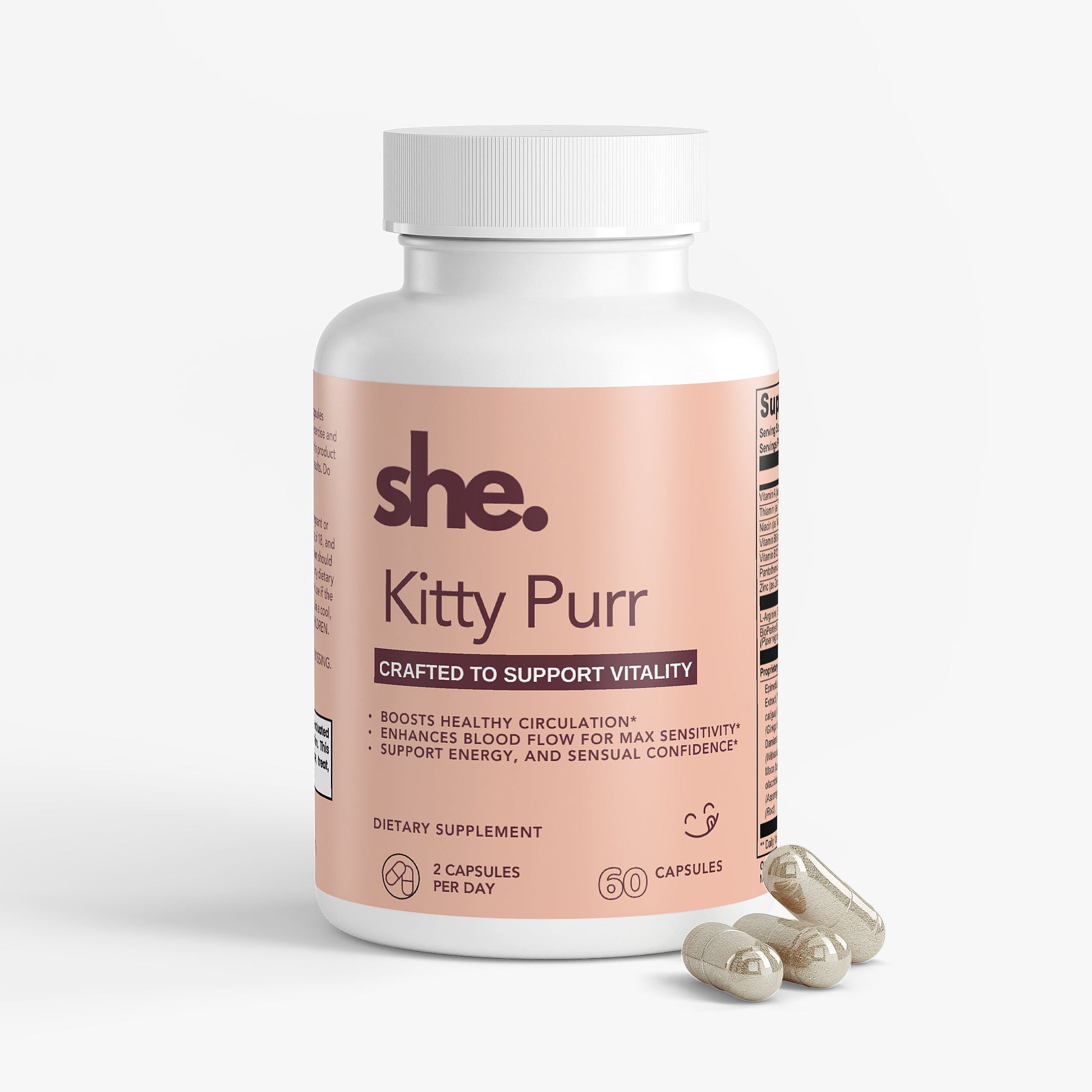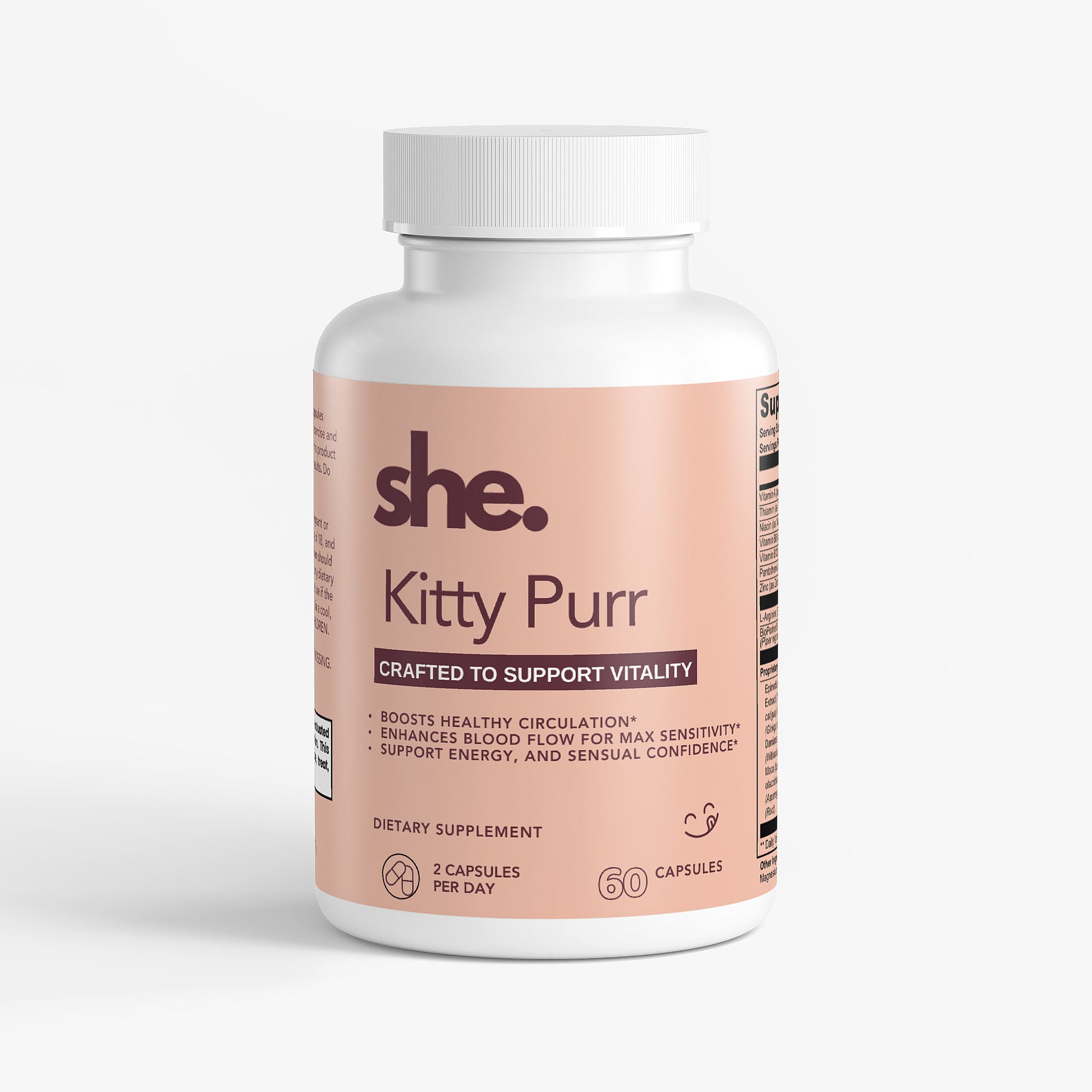 With a carefully chosen mix of vitamins, minerals, and botanicals, Kitty Purr is here to help you reconnect with your sensuality, feel more confident in your body, and unlock the purr that’s been waiting.