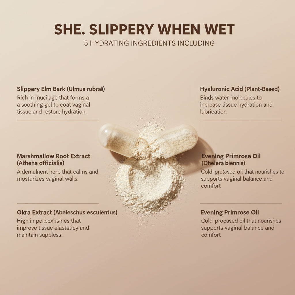 ✨ Slippery When Wet (Moisture Support Capsules) – Blend of slippery elm, marshmallow root, okra, hyaluronic acid, and evening primrose oil to relieve dryness and restore juicy, supple hydration.